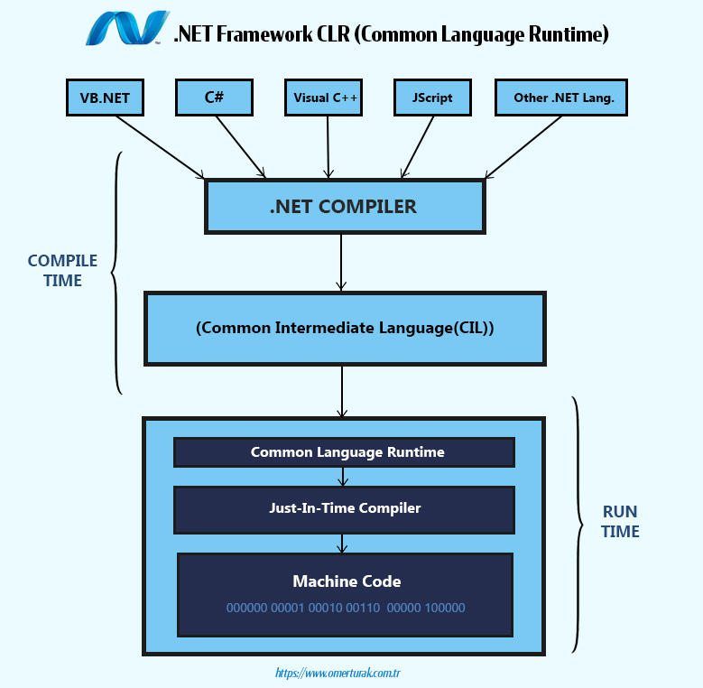 C#' ta yazdığımız kodlar direk makine koduna çevrilmez. .NET Compiler ile program kodu derlendikten sonra Microsoft tarafından oluşturulan CIL (Common Intermediate Language(ara dil))' e çevrilir. Oluşturulan CIL kodu CLR(Common Language Runtime - Ortak Dil Çalışma Zamanı) yardımı ile çalıştırır. Bundan sonra çalıştırılan CIL kodu JIT (Just In Time Compiler) ile derlenerek makine kodu elde edilir.