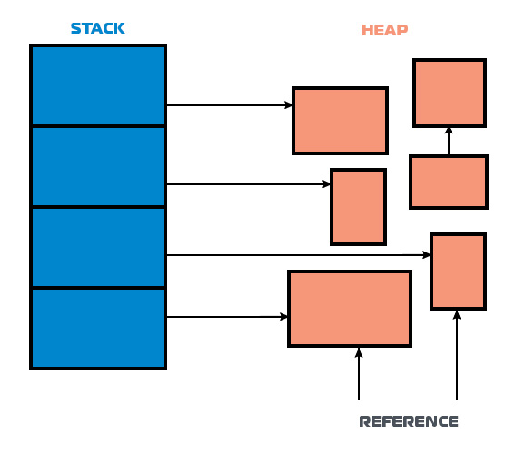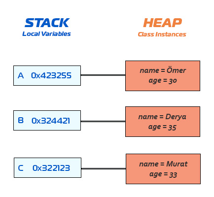Heap Bölgesi: C#'taki bulunan reference(referans) tiplerinin tutulduğu bellek bölgesidir. Dolayısıyla nesnelerin de tutulduğu bölgedir. Bir Sınıfa ait nesne oluşturulunca heap bölgesinde nesneye ait bütün öğeleri içeren bir alan oluşturulur. Bu kısım aynı zamanda nesnenin adresidir. Bu adres bu nesneyi işaret eden referans(işaretçi(resimde bulunan oklar) yada pointer) tarafından bilinir. Aşağıdaki şekilde bu kısma detaylı bir şekilde bakalım.
